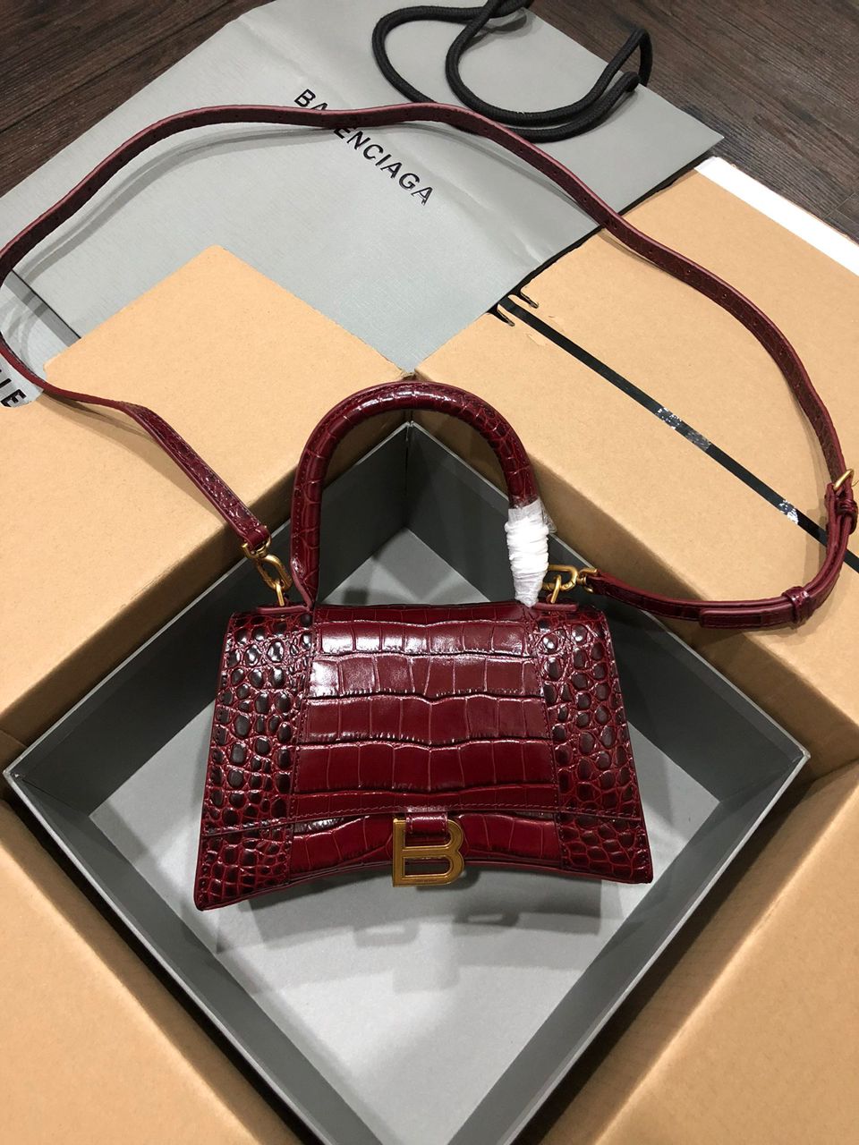 Borsa Balenciaga Hourglass Small in pelle effetto coccodrillo bordeaux