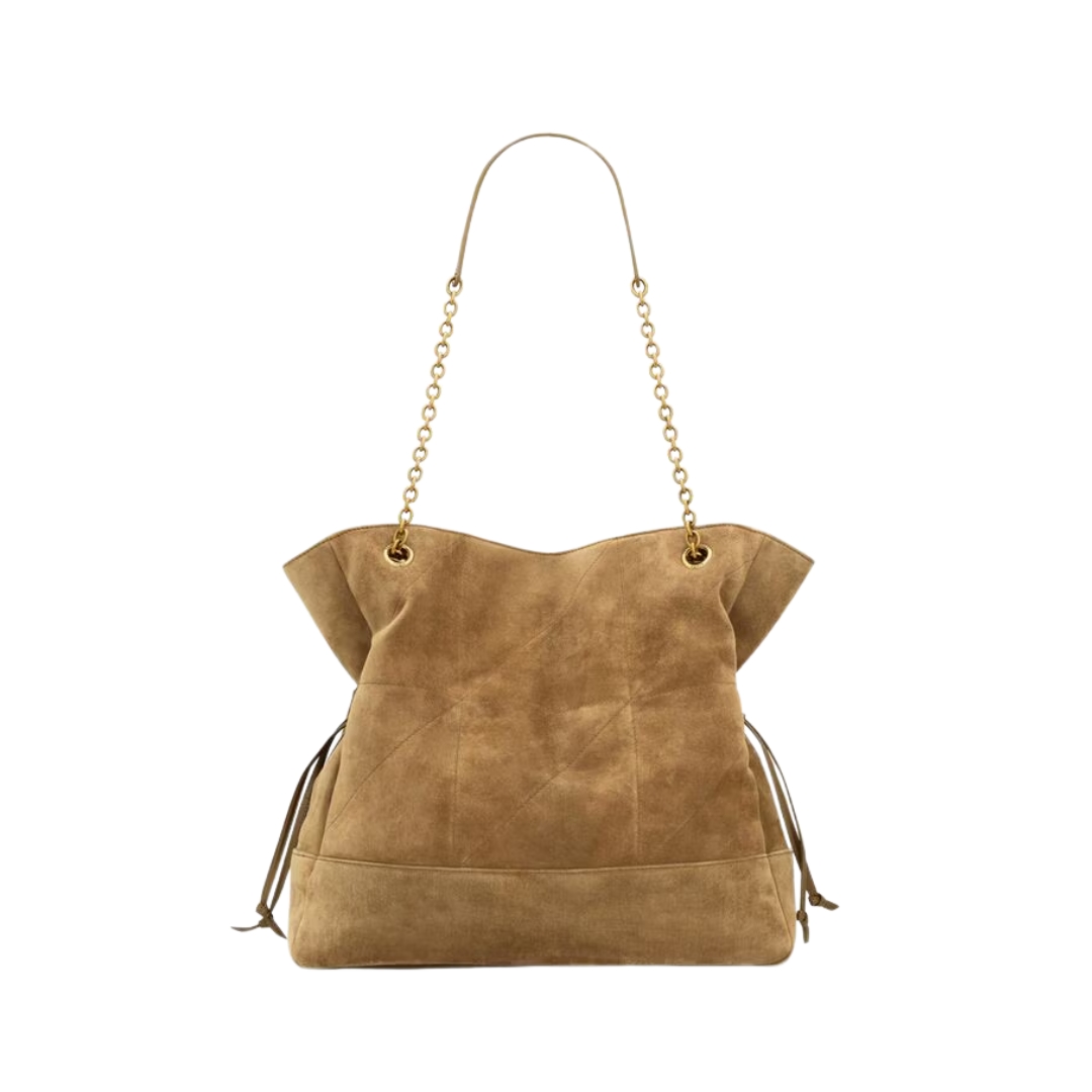 Dimensioni:● Larghezza: 50 cm● Altezza: 32 cm● Profondità: 16 cm Dettagli:● Materiale: Pelle scamosciata (suede)● Colore: Beige● Chiusura: Linguetta centrale