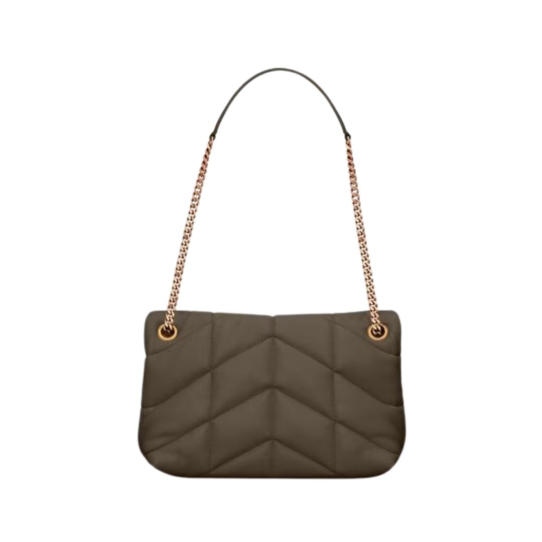 Borsa Saint Laurent Loulou Puffer Small in nappa verde oliva 29 cm