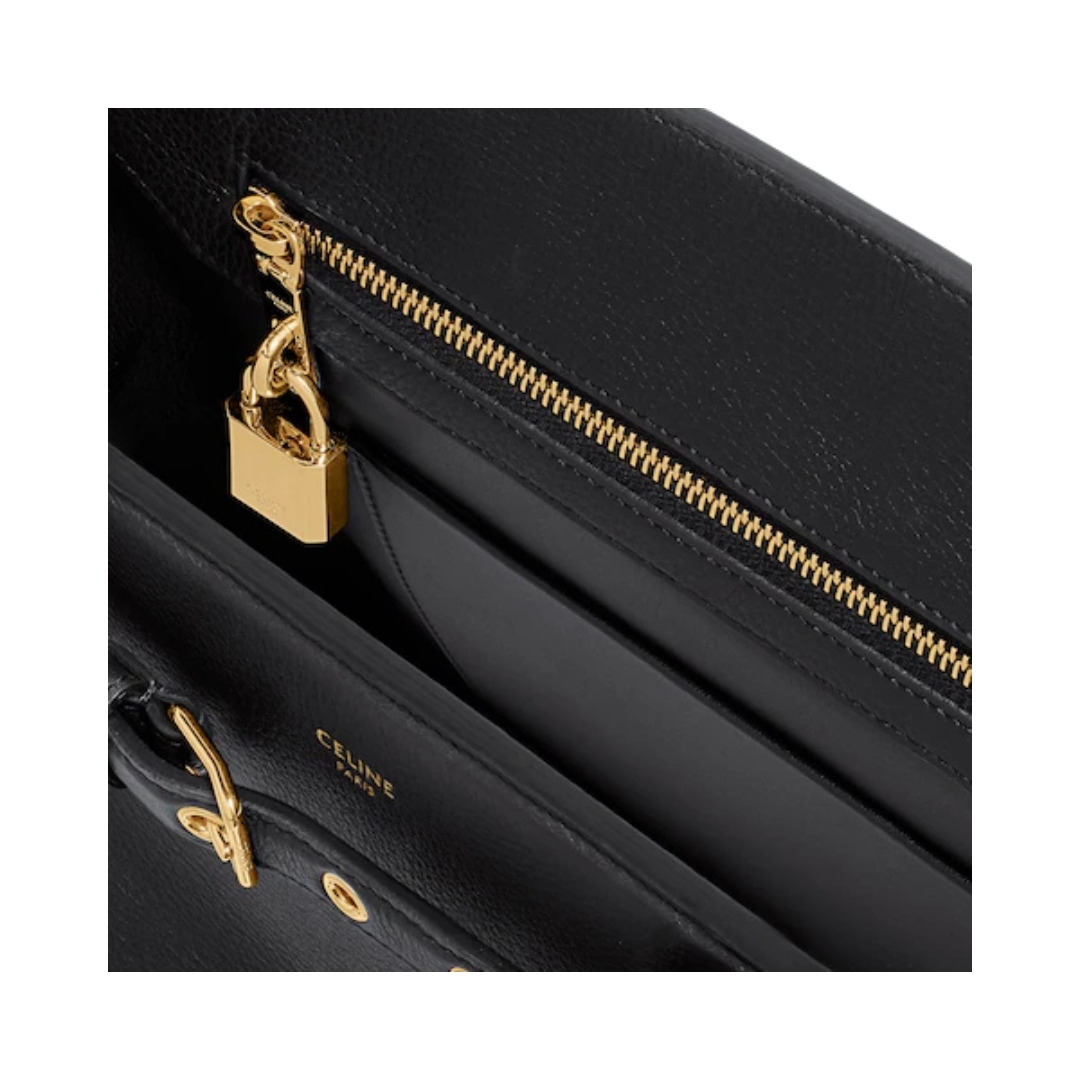 Logo: “CELINE PARIS” inciso a caldo sul fronte della borsa, sotto la patta, in carattere maiuscolo dorato