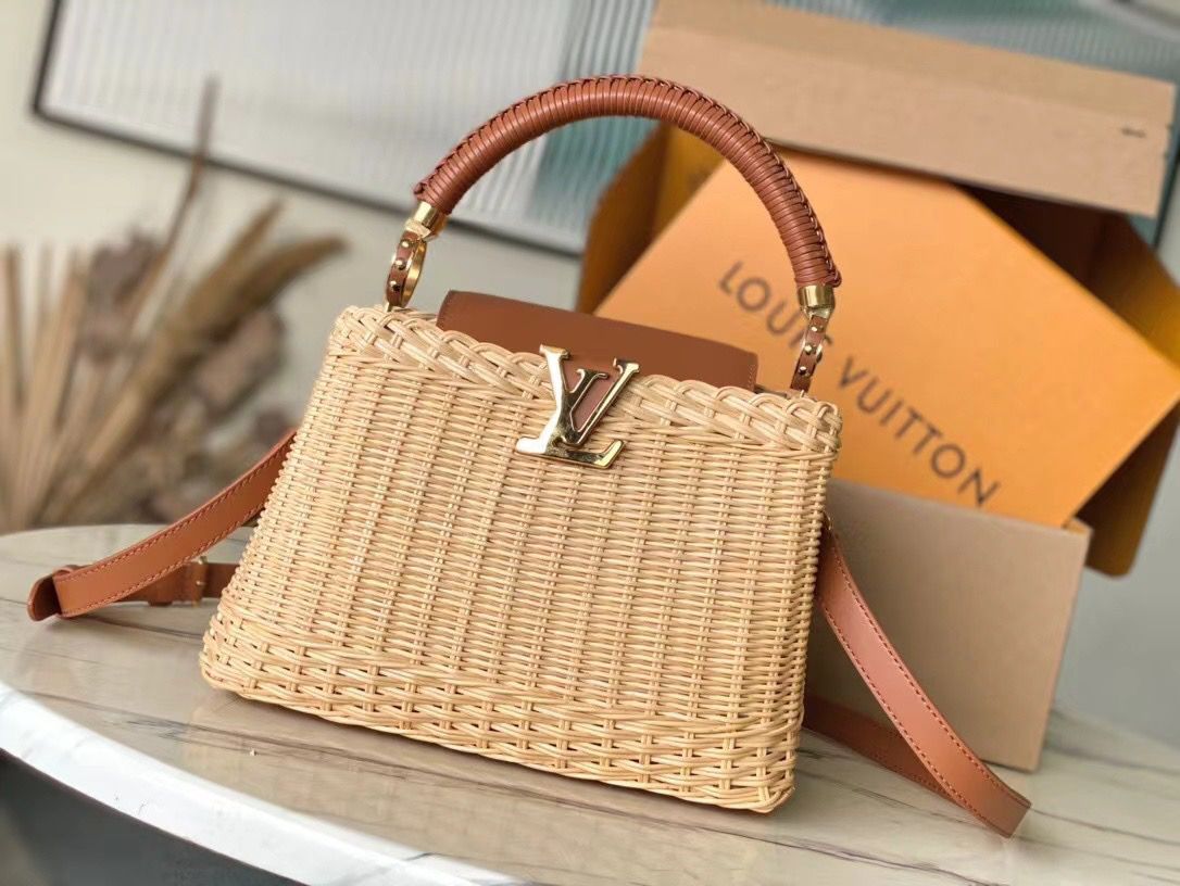 Dimensioni:● Larghezza: 20 cm● Altezza: 12 cm● Profondità: 6 cm Dettagli:● Materiale: Pelle Epi rigida● Colore: Beige con manico marrone●
