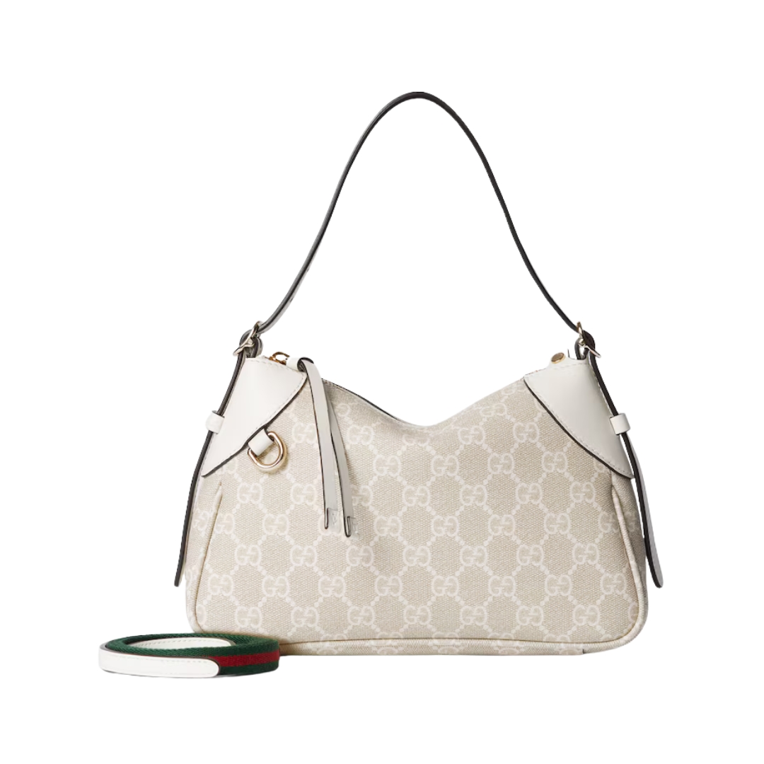 Borsa Gucci GG Emblem in tessuto GG beige e pelle bianca 24.5 cm