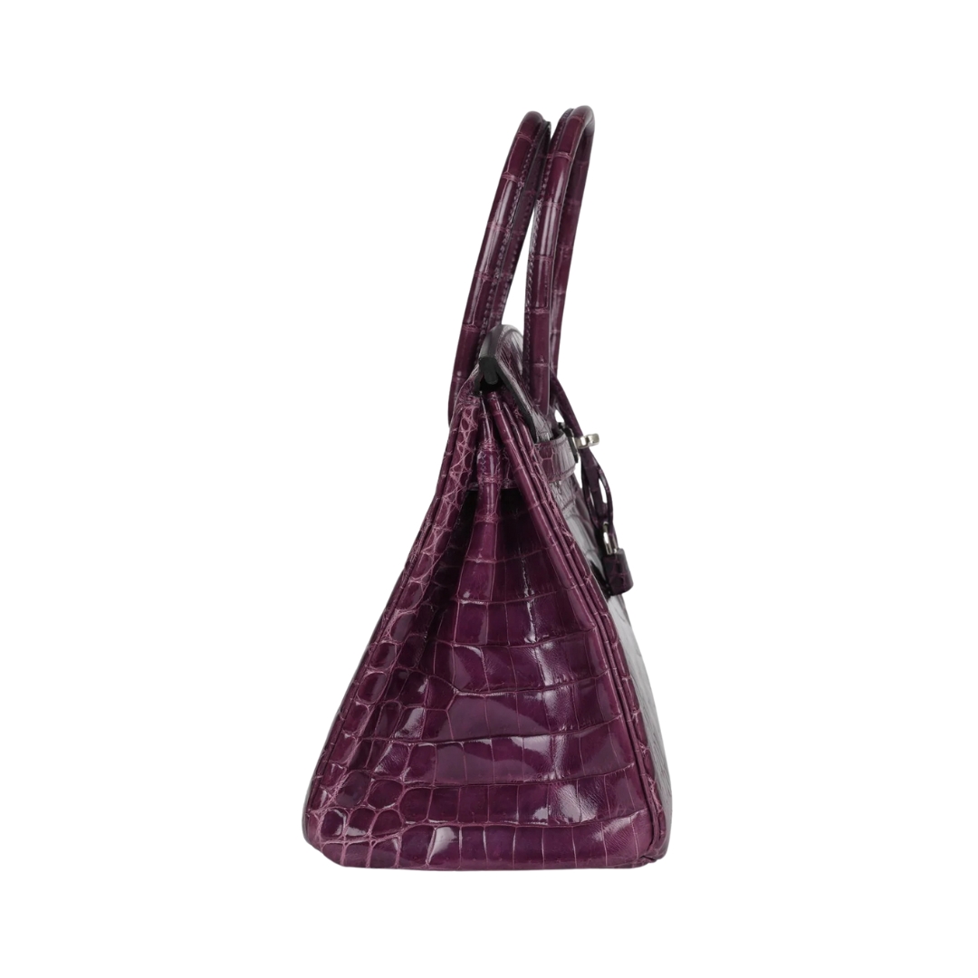 Borsa Hermès Birkin 30 in coccodrillo Niloticus lucido color ametista con hardware in palladio