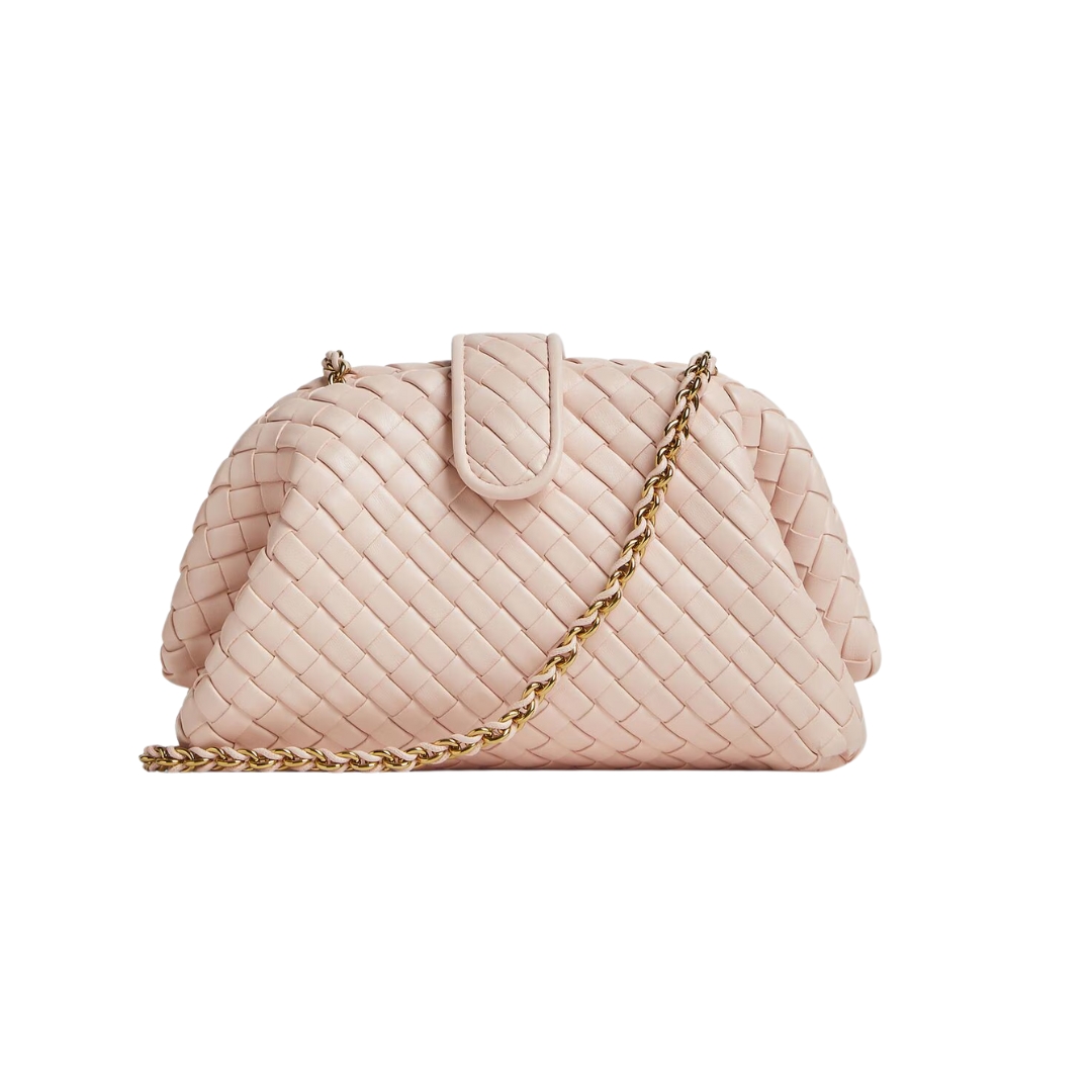 Dimensioni:● Larghezza: 15 cm● Altezza: 11 cm● Profondità: 5 cm Dettagli:● Materiale: Pelle imbottita Intrecciato● Colore: Rosa cameo● Chiusura: Chiusura