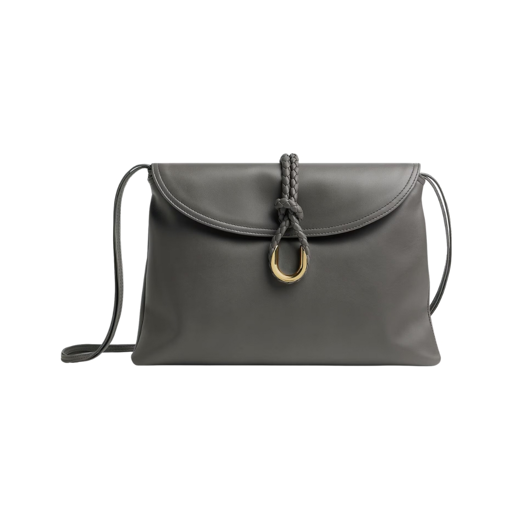 Dimensioni:● Larghezza: 23 cm● Altezza: 15 cm● Profondità: 6 cm Dettagli:● Materiale: Pelle di vitello liscia● Colore: Grigio lapilli● Chiusura: