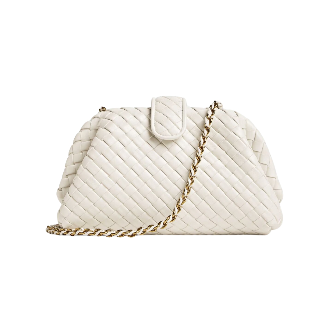 Dimensioni:● Larghezza: 15 cm● Altezza: 11 cm● Profondità: 5 cm Dettagli:● Materiale: Pelle imbottita Intrecciato● Colore: Bianco gesso● Chiusura: Chiusura