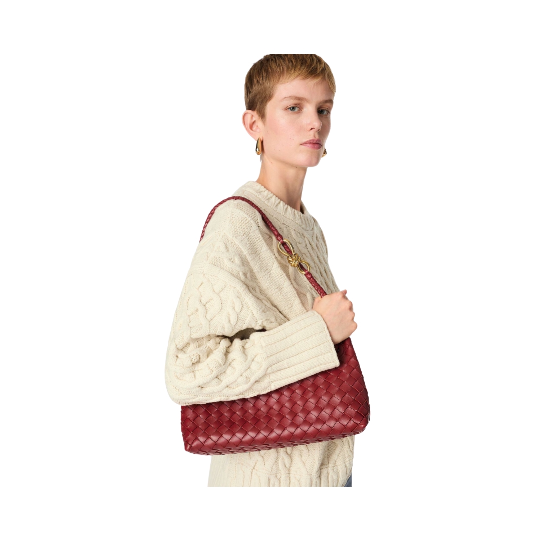 Dimensioni:● Larghezza: 12 cm● Altezza: 8 cm● Profondità: 4 cm Dettagli:● Materiale: Pelle intrecciata● Colore: Rosso barolo● Chiusura: Patta magnetica●