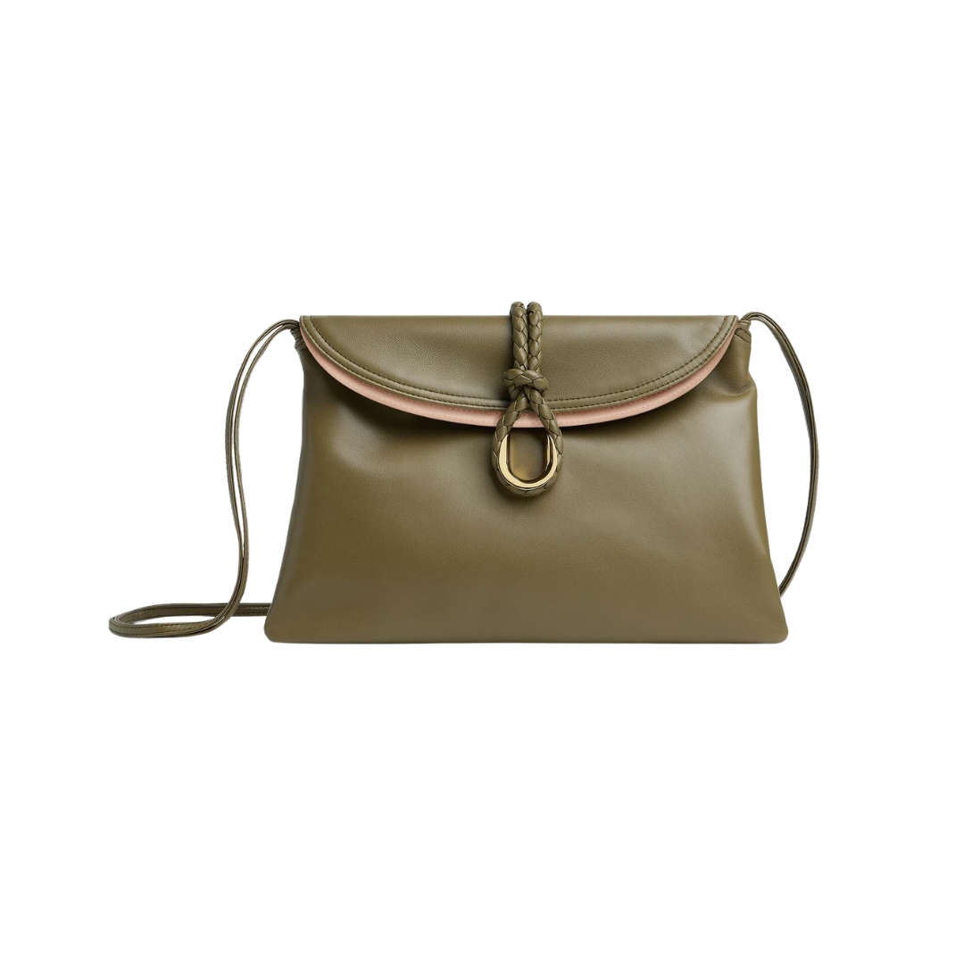 Dimensioni:● Larghezza: 23 cm● Altezza: 15 cm● Profondità: 6 cm Dettagli:● Materiale: Pelle di vitello liscia● Colore: Verde alga● Chiusura: