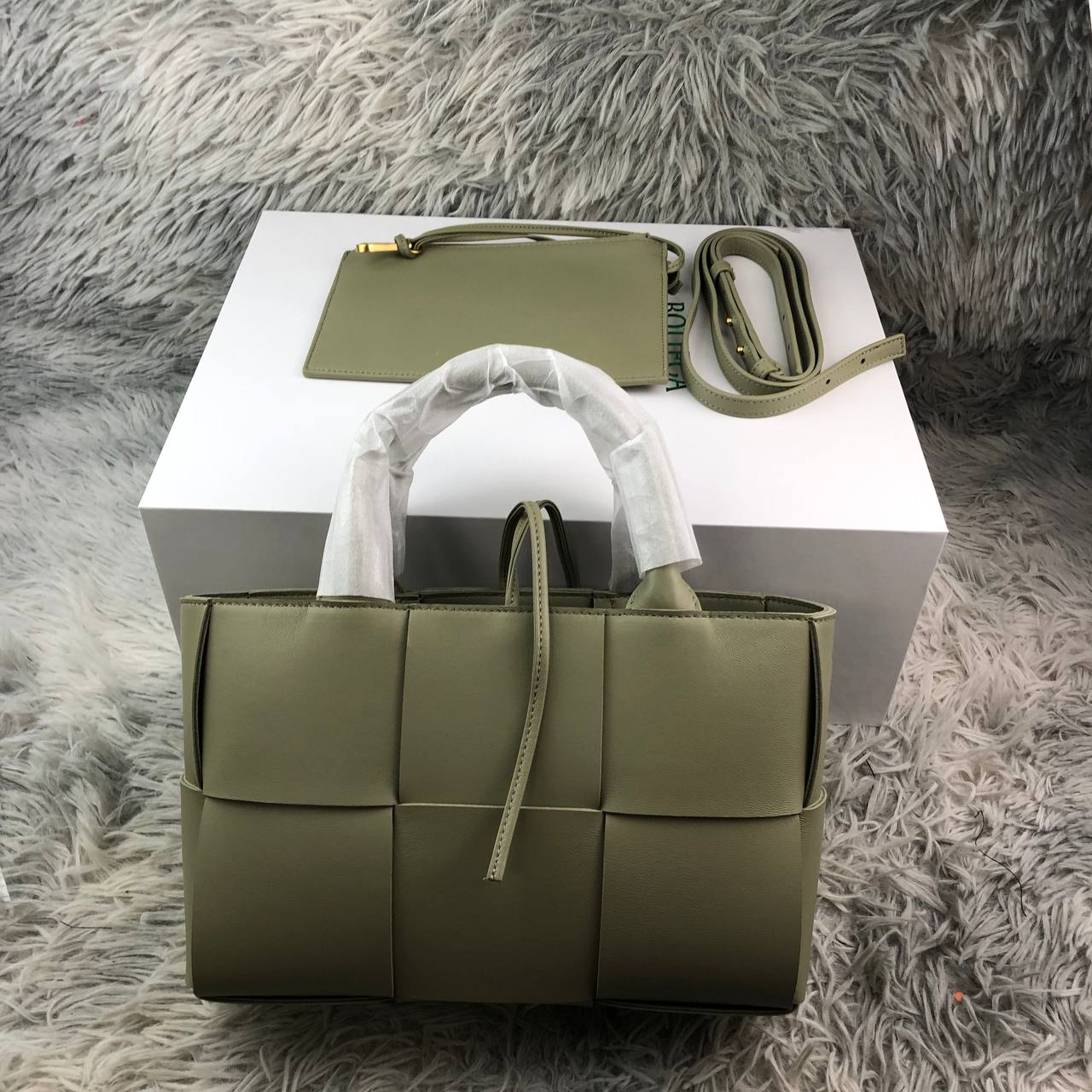 Dimensioni:● Larghezza: 25 cm● Altezza: 20 cm● Profondità: 10 cm Dettagli:● Materiale: Pelle intrecciata● Colore: Verde travertino● Chiusura: Aperta● Logo: