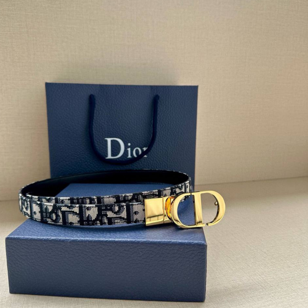 Dettagli:● Materiale: pelle● Colore: blu e beige● Chiusura: fibbia 30 Montaigne● Logo: CD dorato● Larghezza: 2 cm● Parti metalliche: finitura