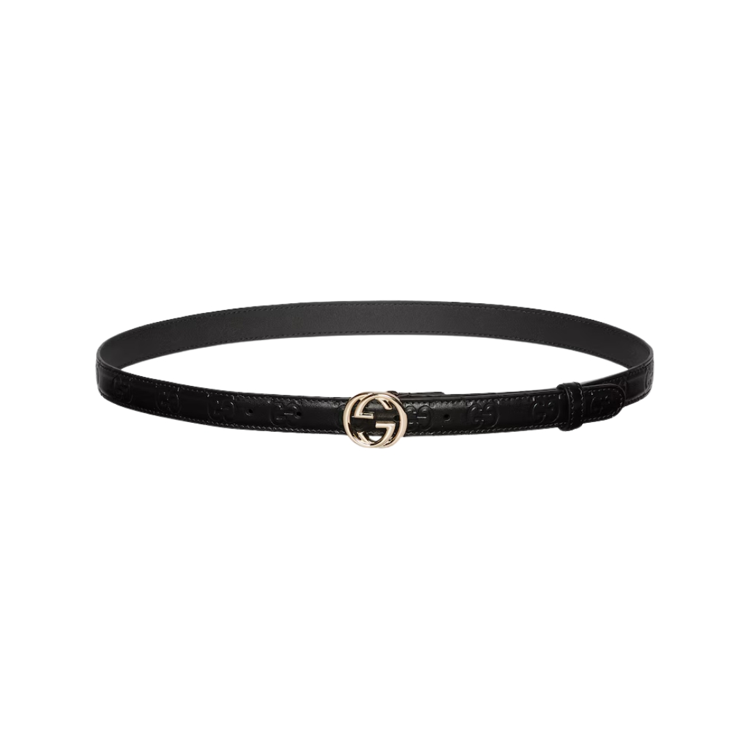 Dimensioni:● Altezza cintura: 3 cm Dettagli:● Materiale: pelle liscia● Colore: nero● Chiusura: fibbia G intrecciata dorata● Logo: G intrecciata frontale●