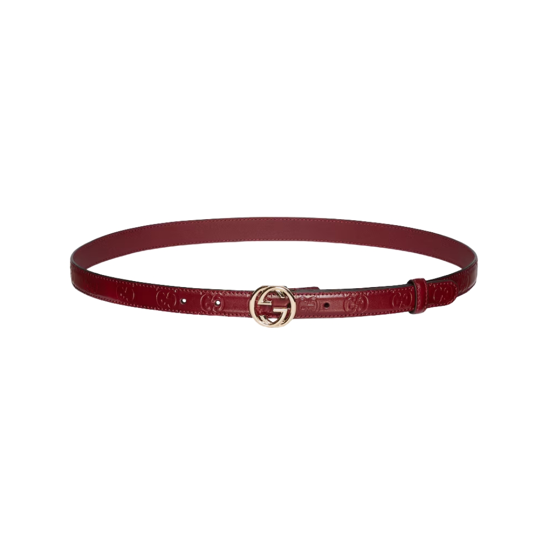 Dettagli:● Materiale: Pelle● Colore: Rosso ciliegia● Chiusura: Fibbia GG● Logo: GG dorato intrecciato● Altezza cintura: 2 cm● Parti metalliche: Dorate