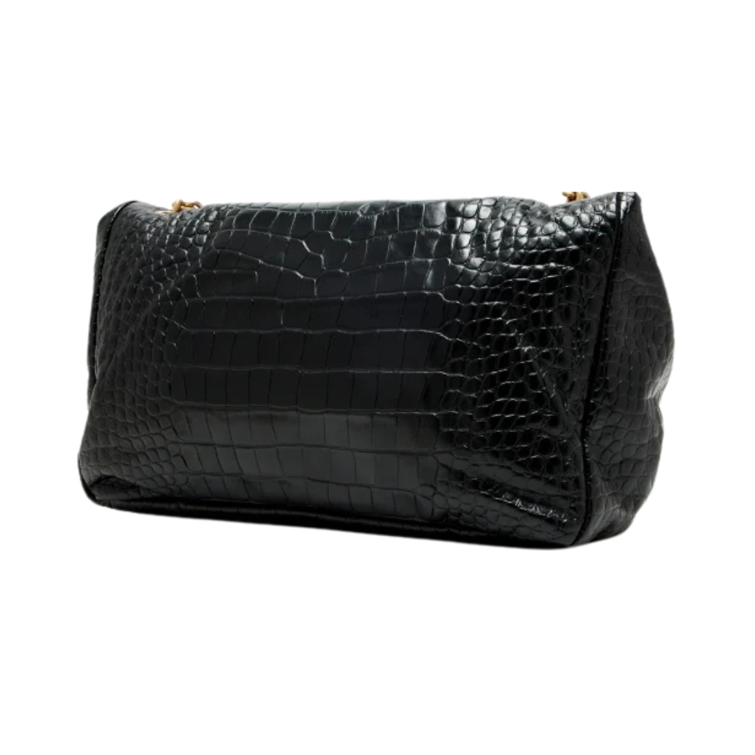 Dimensioni:● Larghezza: 34 cm● Altezza: 19 cm● Profondità: 9 cm Dettagli:● Materiale: Pelle di vitello martellata● Colore: Nero● Chiusura: Patta