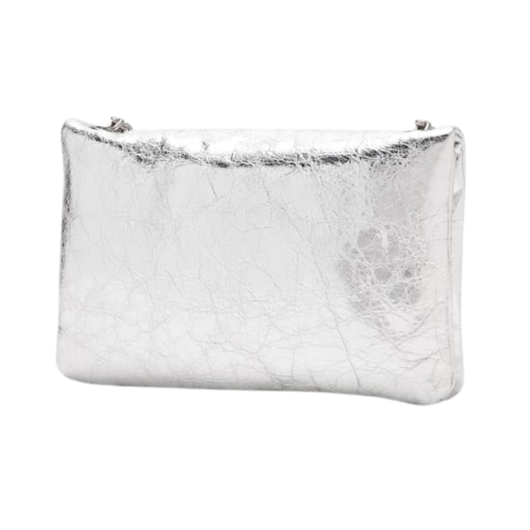 Dimensioni:● Larghezza: 18 cm● Altezza: 12 cm● Profondità: 5 cm Dettagli:● Materiale: Pelle metallizzata● Colore: Argento● Chiusura: Zip superiore● Logo: