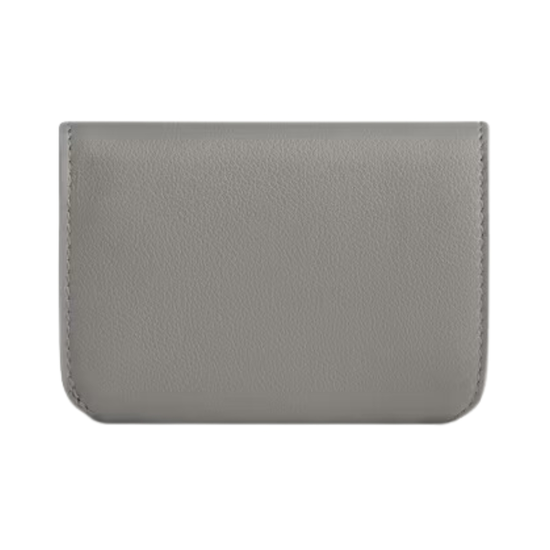 Dimensioni:● Larghezza: 11 cm● Altezza: 8 cm● Profondità: 3 cm Dettagli:● Materiale: Pelle di vitello● Colore: Grigio cielo● Chiusura: Patta