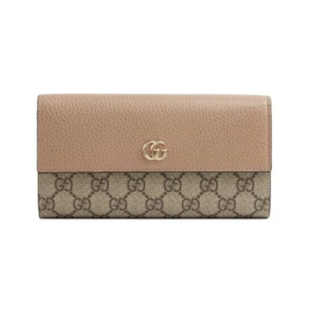 Portafoglio Gucci GG Marmont in pelle marrone e tela GG beige 19 cm