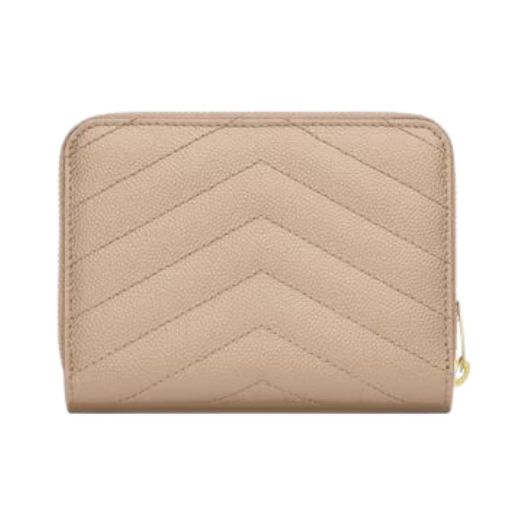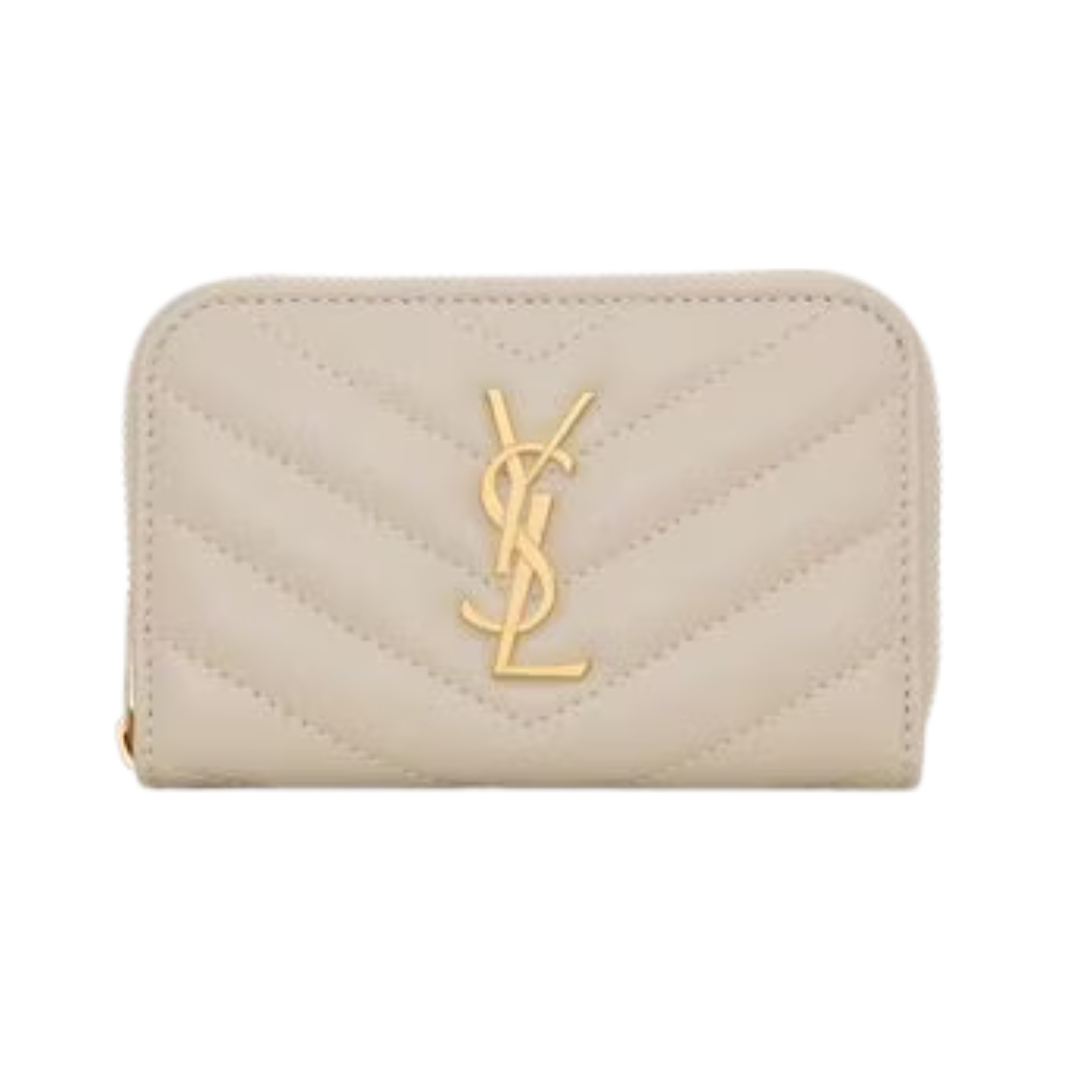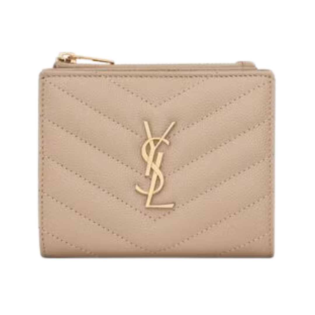 Dettagli:● Materiale: Pelle grain de poudre● Colore: Beige● Chiusura: Bottone a pressione● Logo: YSL dorato● Interno: Scomparti per carte e