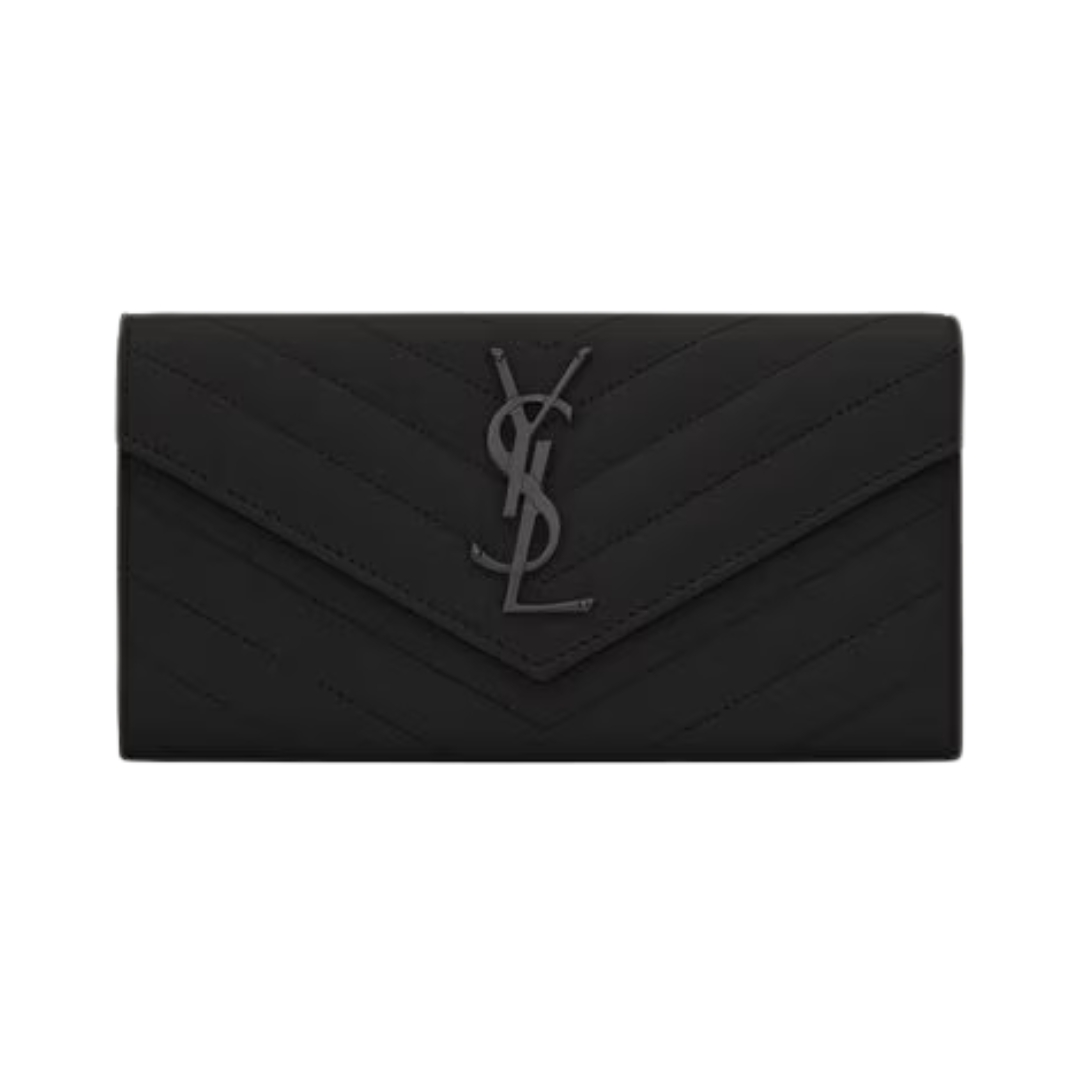 Dettagli:● Materiale: Pelle grain de poudre matelassé● Colore: Nero● Chiusura: Bottone a pressione● Logo: Monogram YSL dorato● Interno: Slot per