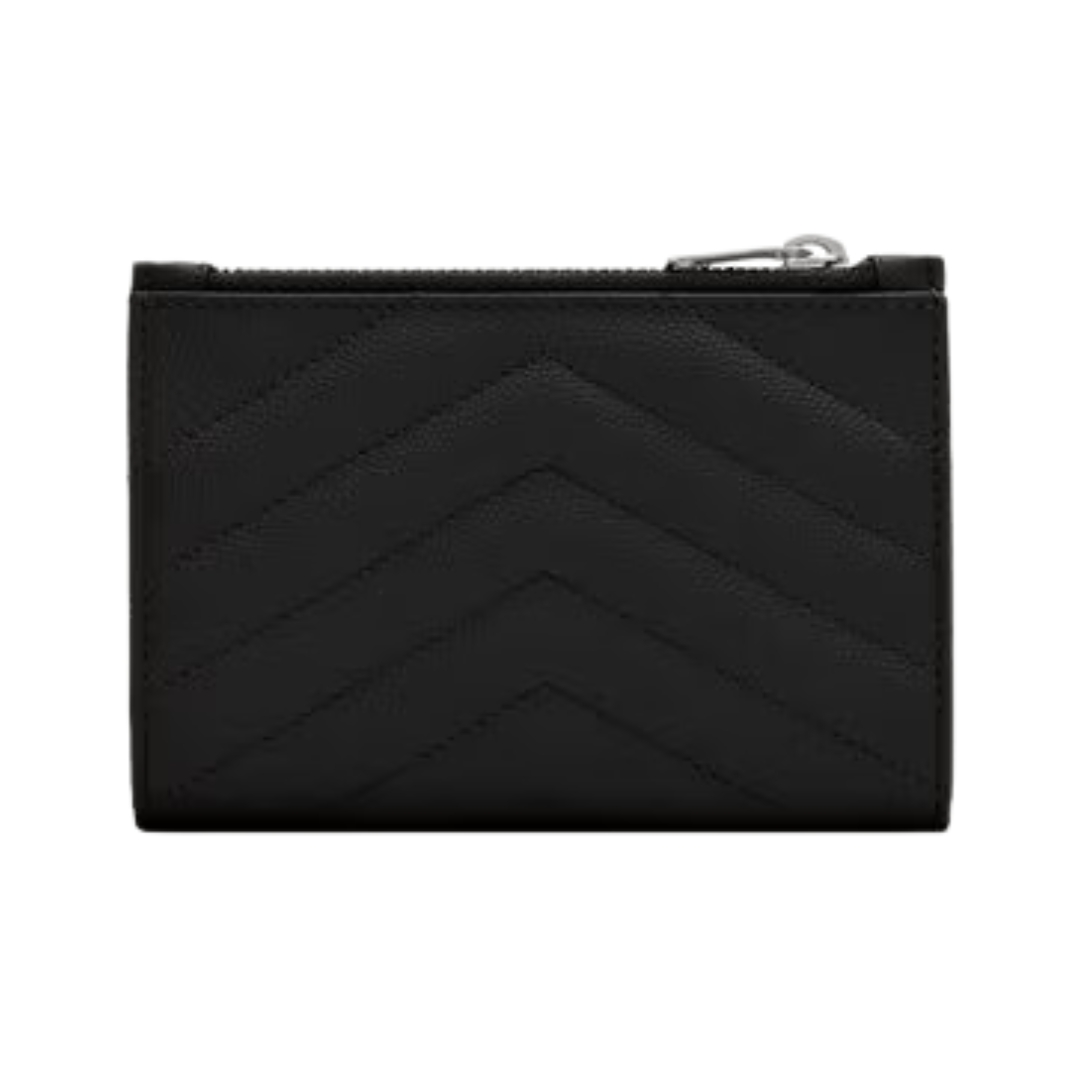 Portafoglio Saint Laurent Cassandre Matelassé Tri-Fold compatto in pelle Grain de Poudre nera 10.5 cm