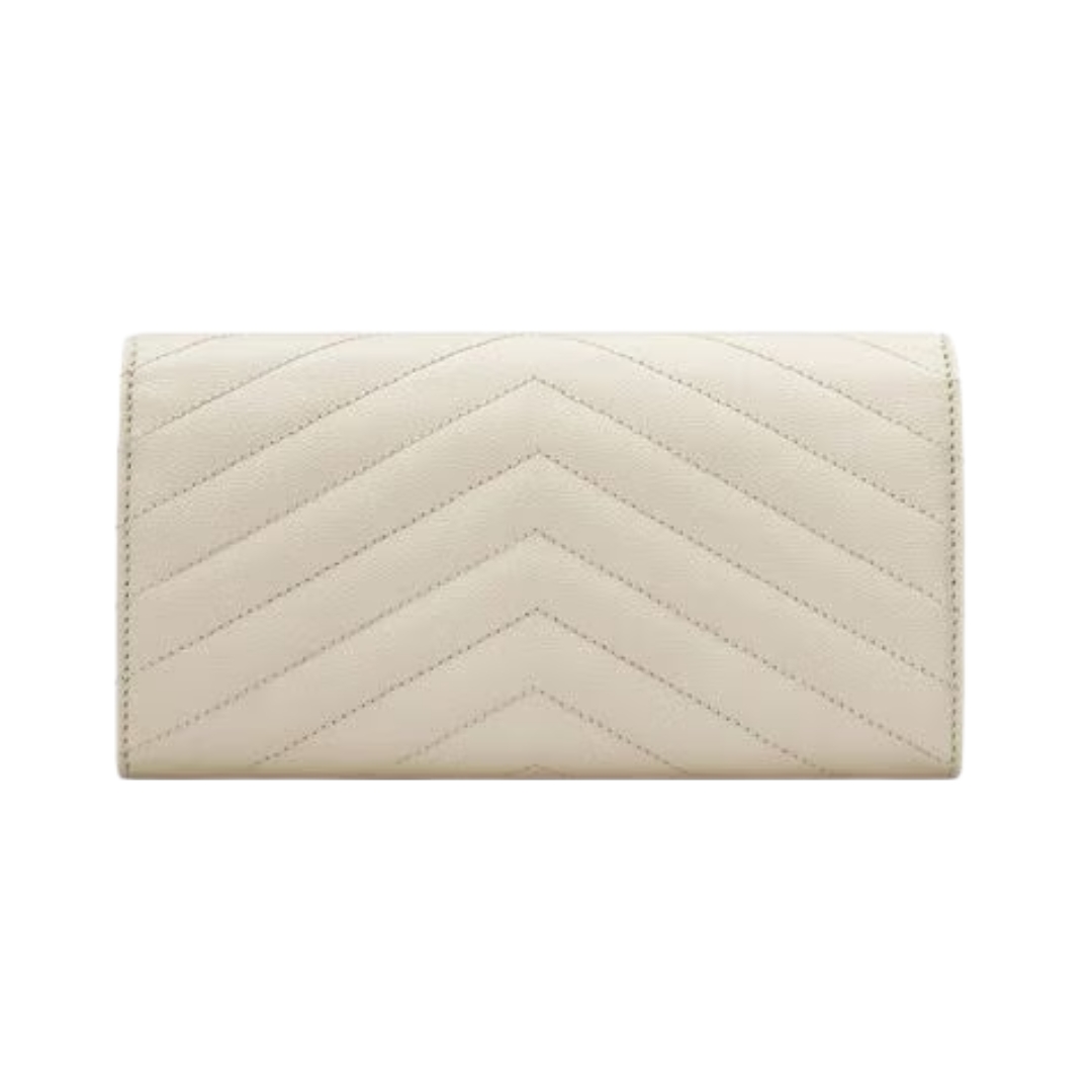 Dettagli:● Materiale: Pelle grain de poudre● Colore: Beige sabbia● Chiusura: Patta con bottone● Logo: YSL dorato● Interno: Scomparti per carte