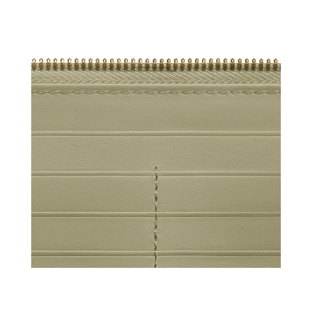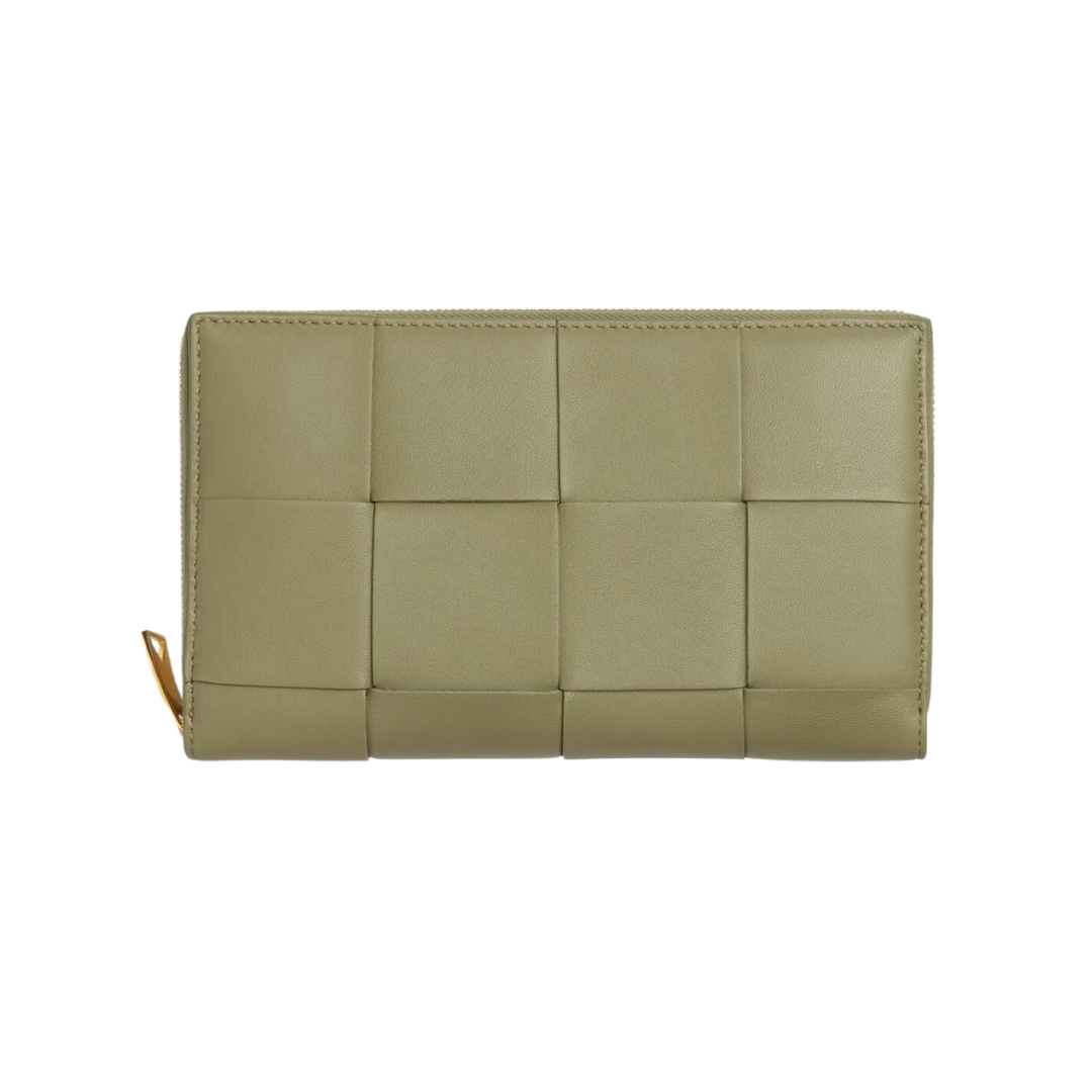 Dettagli:● Materiale: Pelle intrecciata● Colore: Travertino● Chiusura: Zip● Logo: Inciso all’interno● Interno: Tasca centrale e slot carte● Parti metalliche: Tinta