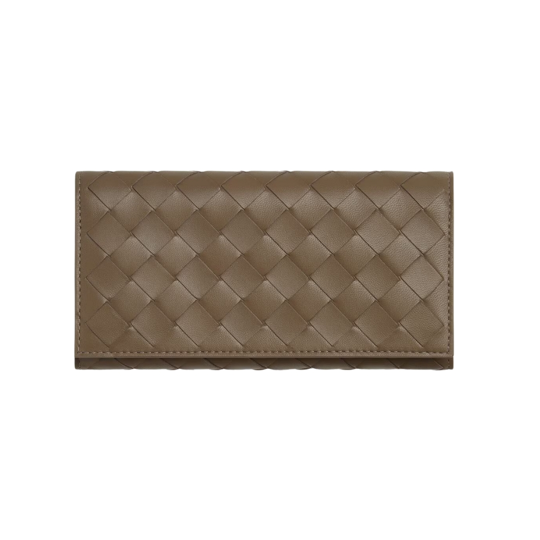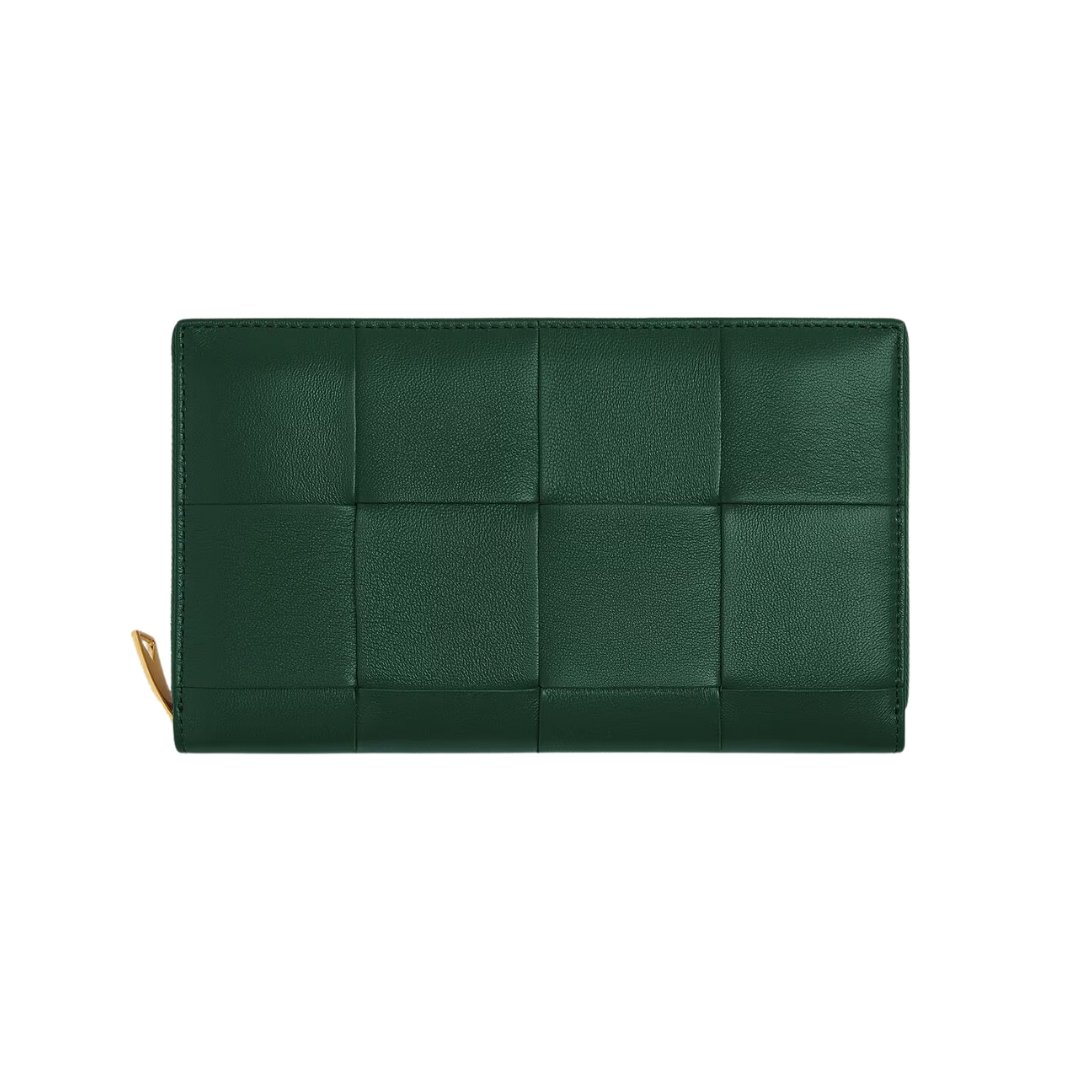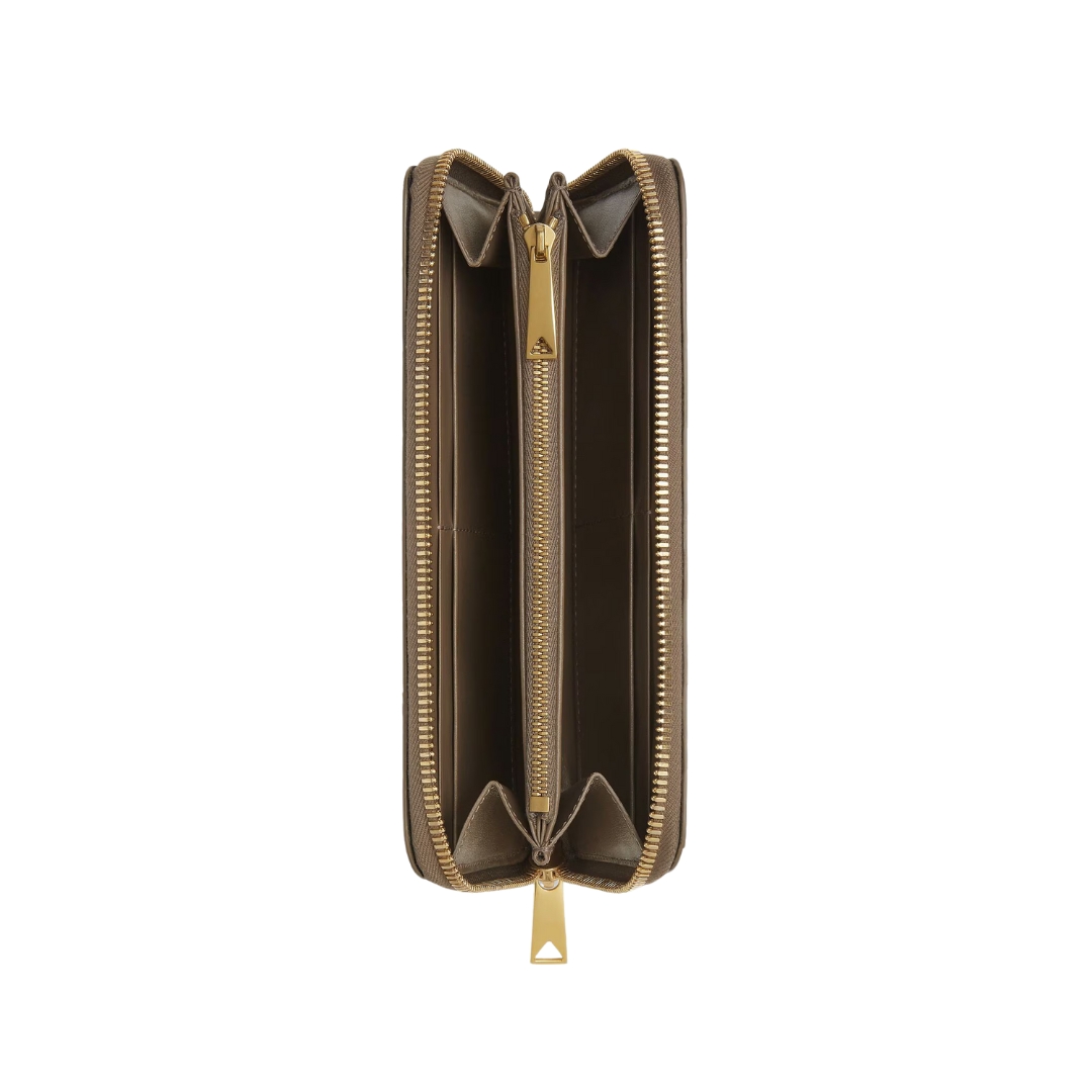 Dettagli:● Materiale: Pelle intrecciata● Colore: Marrone pigna● Chiusura: Zip● Logo: Interno inciso● Interno: Slot carte e banconote● Parti metalliche: Brunite●