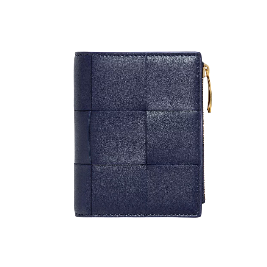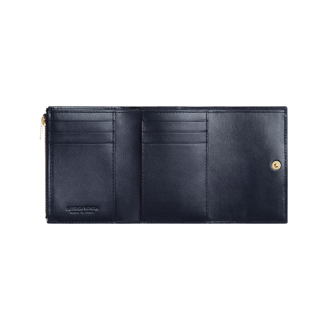 Dimensioni:● Larghezza: 9 cm● Altezza: 7.5 cm● Profondità: 2 cm Dettagli:● Materiale: pelle di vitello intrecciata● Colore: blu Space● Chiusura: