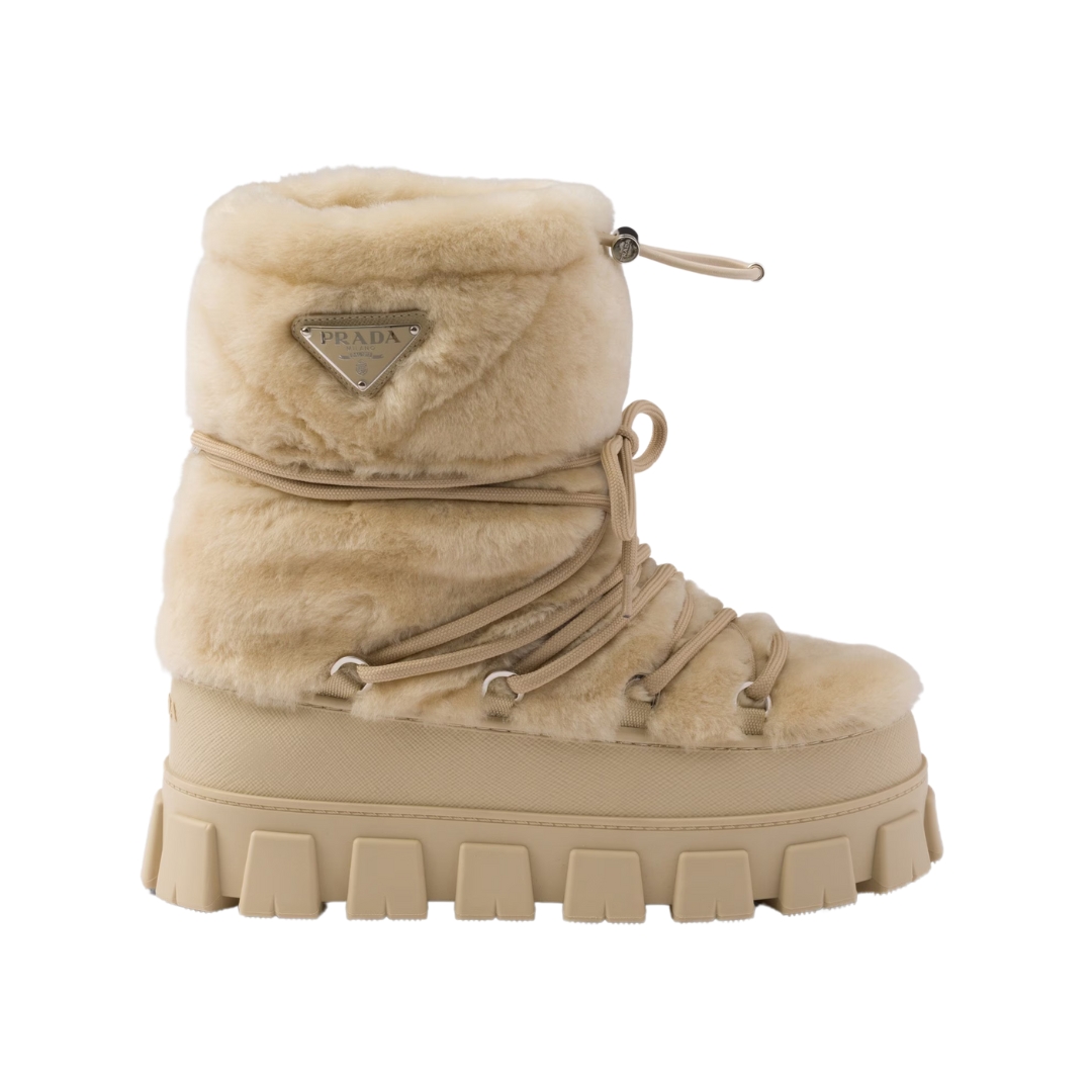 Dettagli:● Materiale: Shearling e suede● Colore: Beige● Chiusura: Lacci frontali● Logo: Triangolo Prada cucito lateralmente● Suola: In gomma carrarmato● Interno: