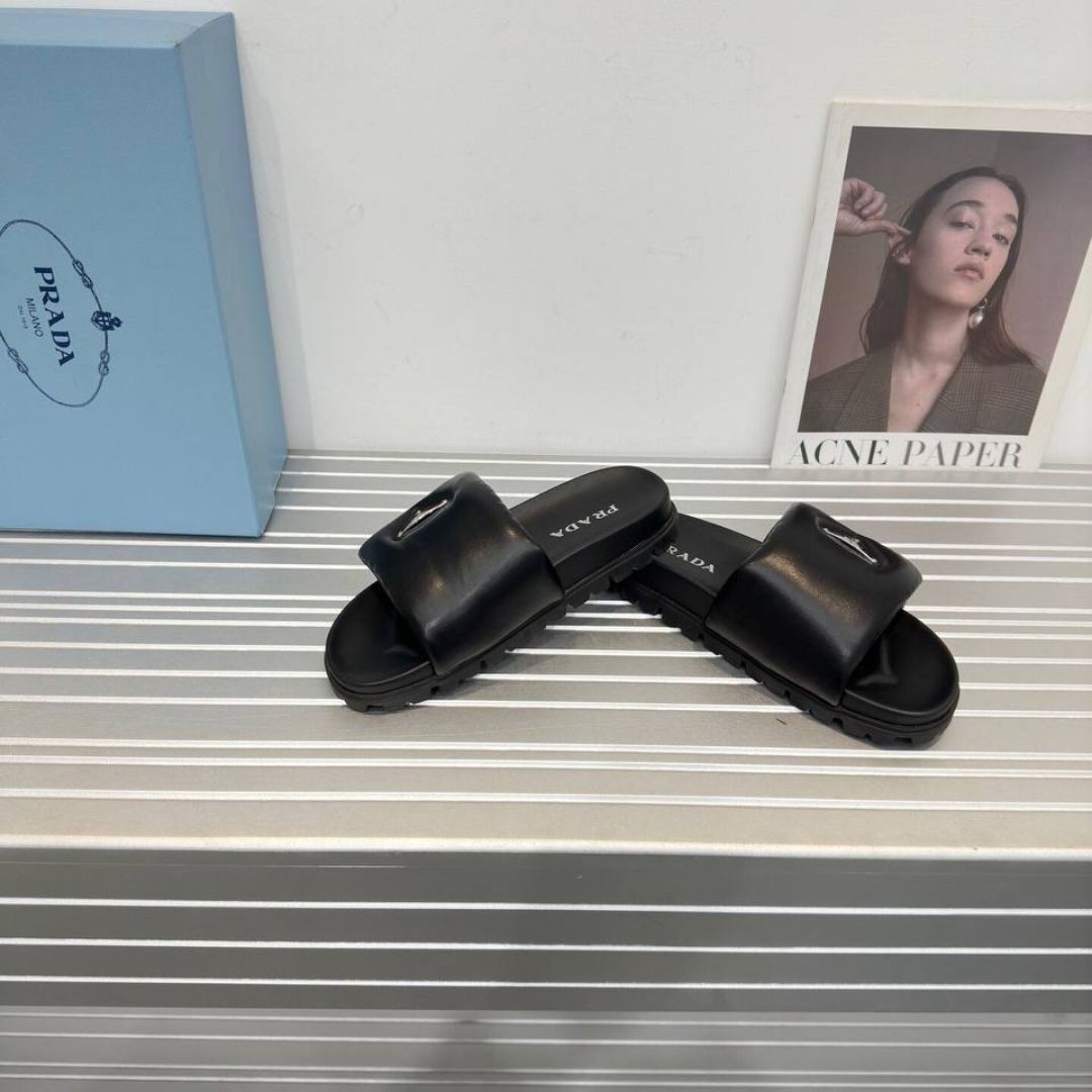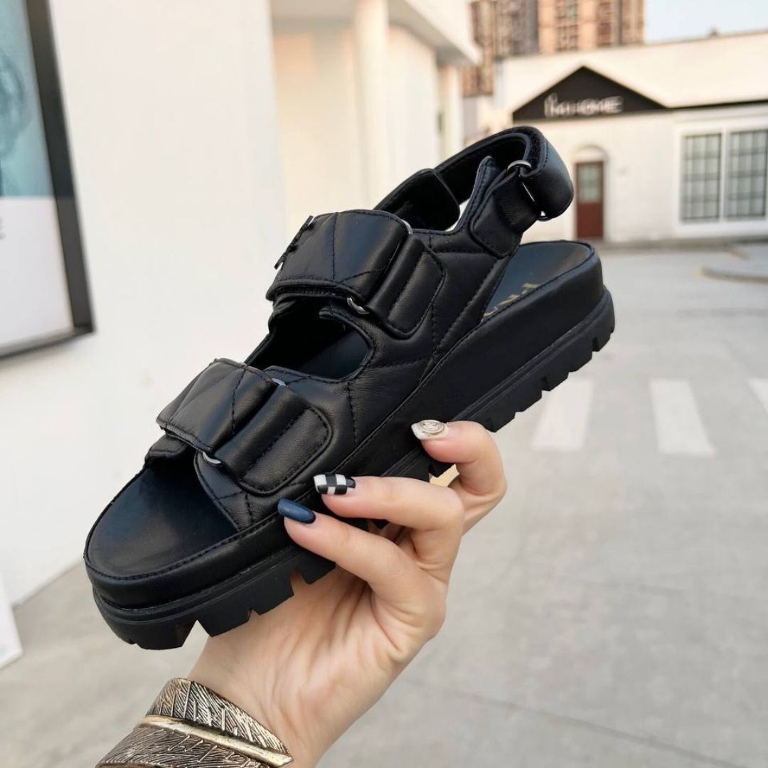 Dettagli:● Materiale: Pelle di vitello● Colore: Nero● Chiusura: Fibbia regolabile● Logo: Triangolo Prada in gomma● Suola: In gomma zigrinata● Interno:
