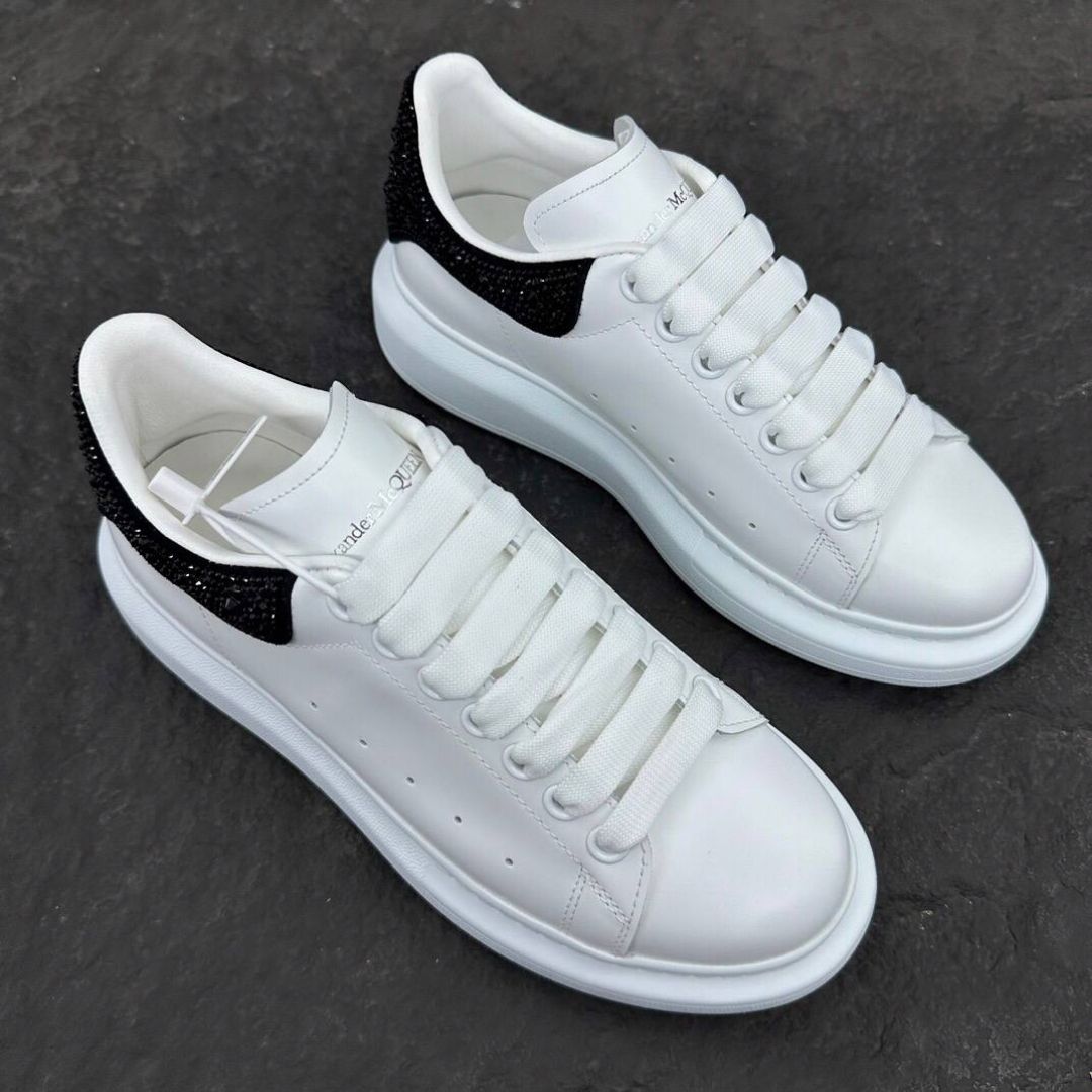Dettagli:● Materiale: Pelle liscia e inserti con cristalli● Colore: Bianco con tallone nero glitterato● Chiusura: Lacci bianchi● Logo: Logo Alexander