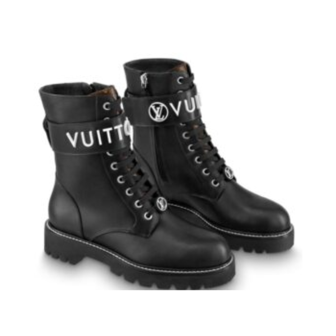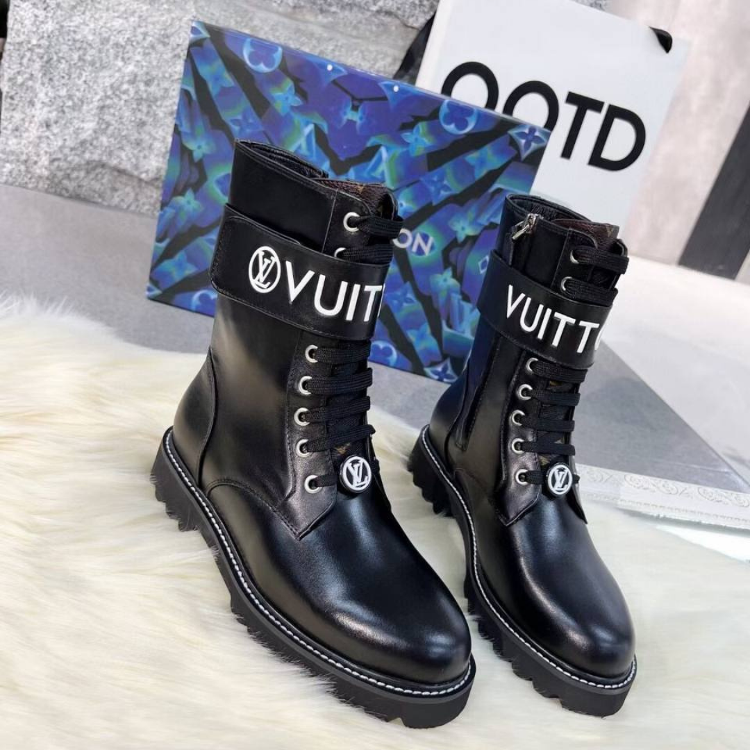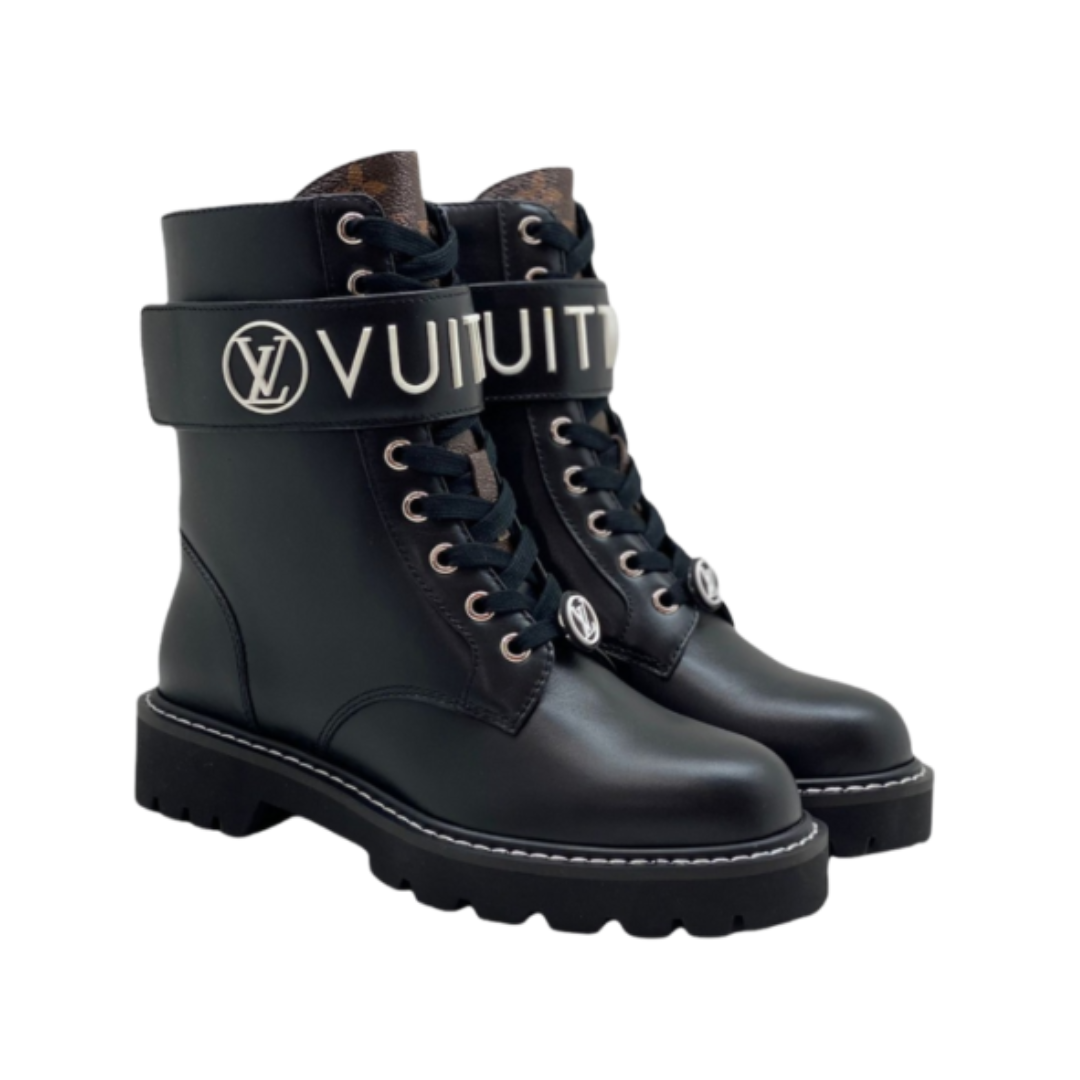 Dettagli:● Materiale: Pelle di vitello● Colore: Nero● Chiusura: Lacci frontali + zip laterale● Logo: Scritta “VUITTON” bianca sul gambale● Suola: