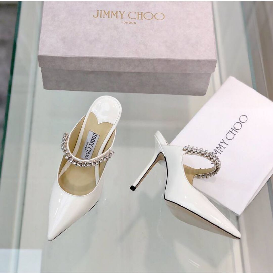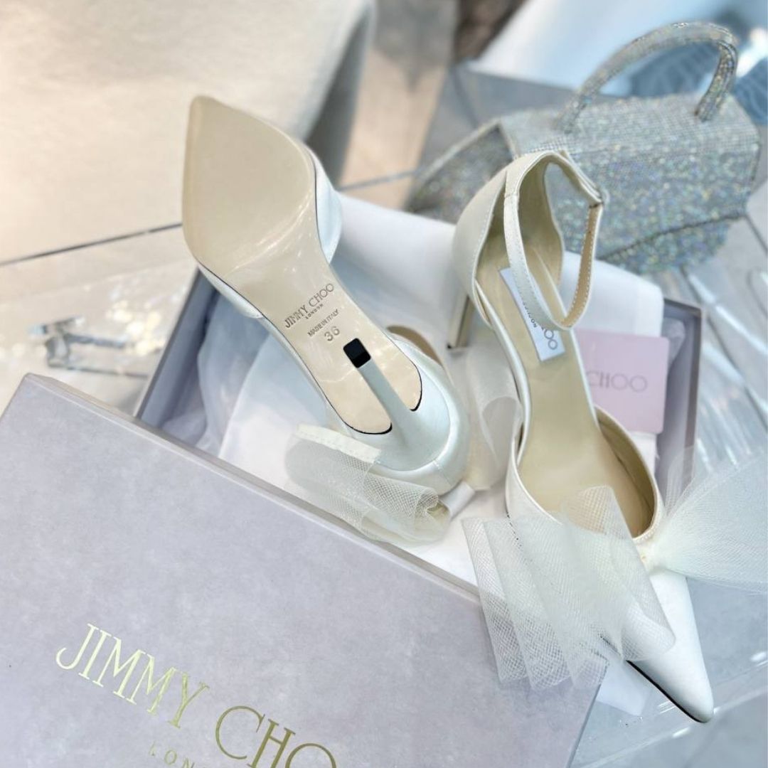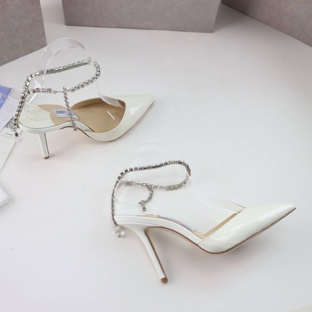 Dettagli:● Materiale: Raso di seta● Colore: Bianco● Chiusura: Cinturino con cristalli alla caviglia● Logo: Interno dorato Jimmy Choo● Suola: Cuoio●