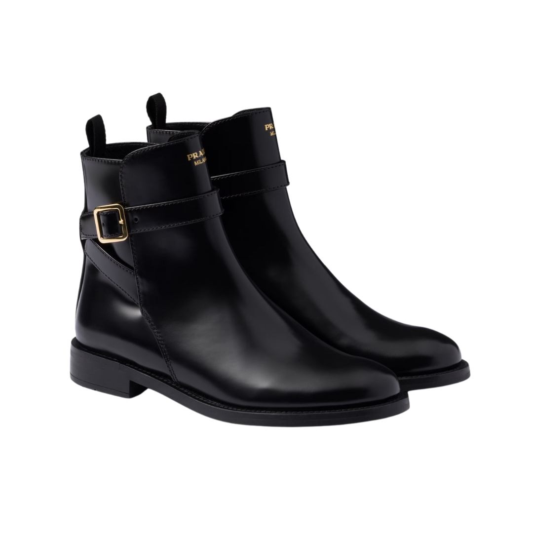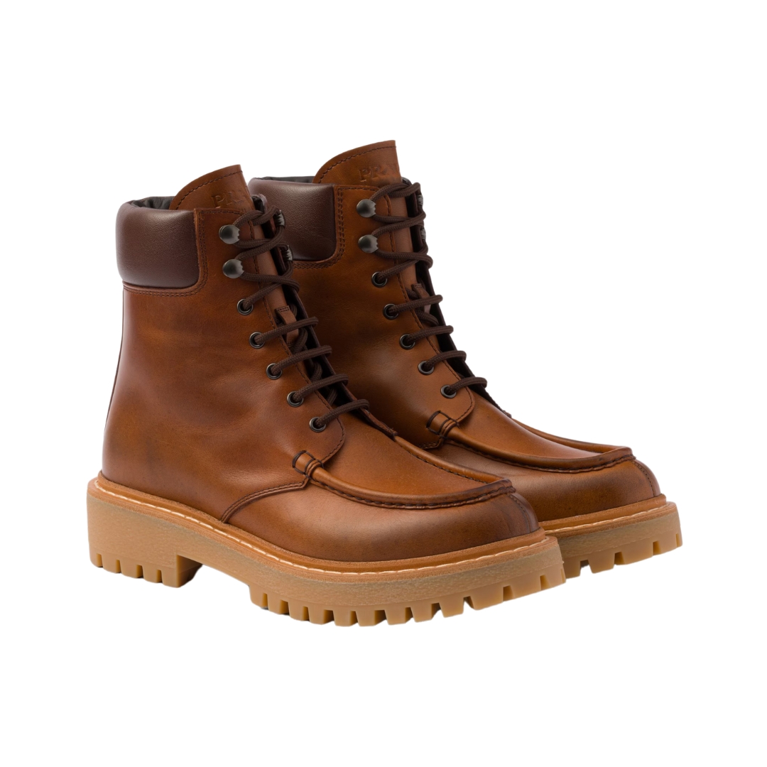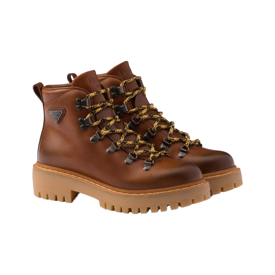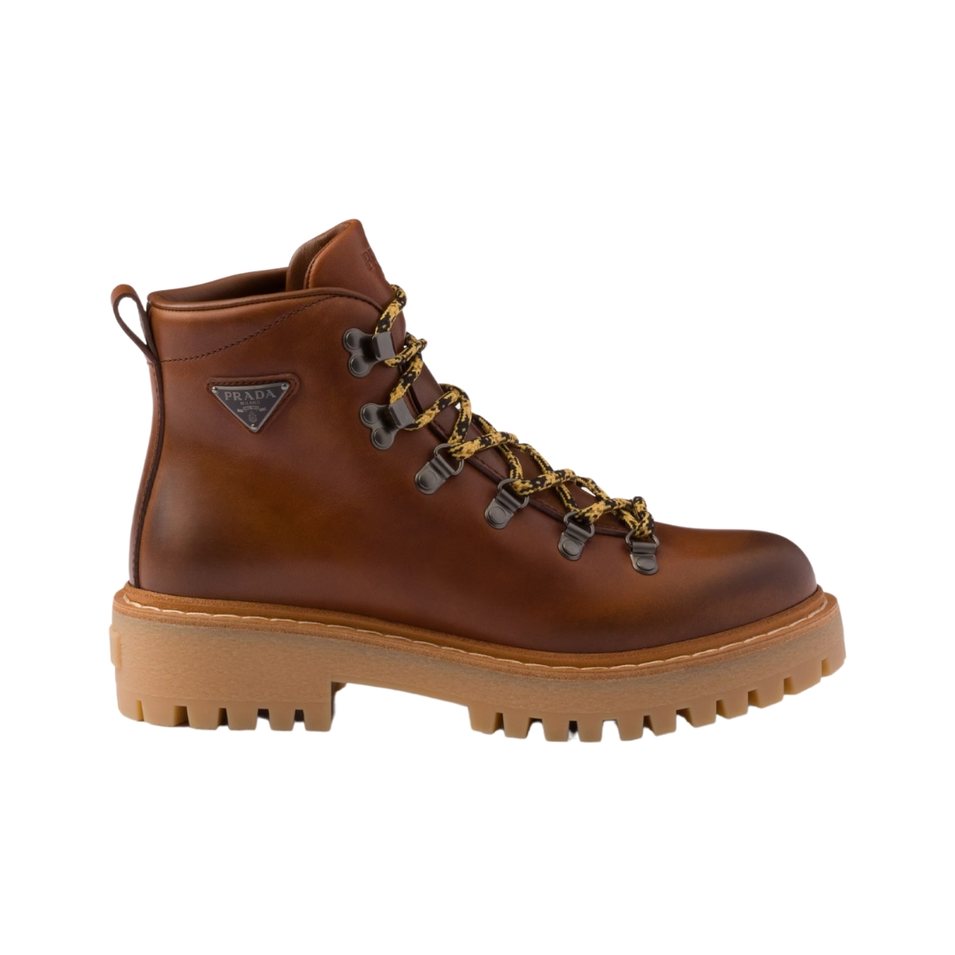 Dettagli:● Materiale: Pelle liscia● Colore: Cognac● Chiusura: Lacci con occhielli metallici● Logo: Triangolo Prada laterale in rilievo● Suola: Carrarmato in