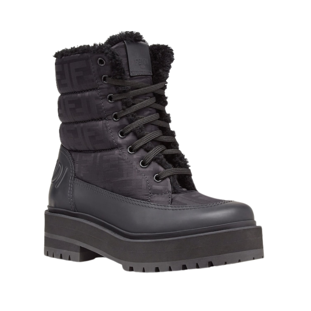 Dettagli:● Materiale: Pelle di vitello e tessuto jacquard FF● Colore: Nero e marrone● Chiusura: Lacci frontali● Logo: Motivo FF in