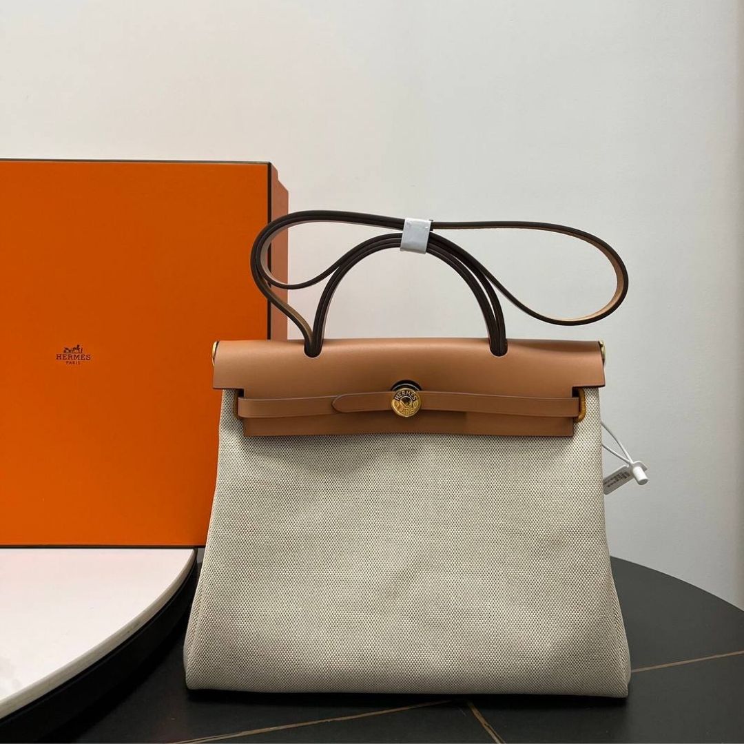 Borsa Hermès Herbag in tela écru e pelle marrone 31 cm