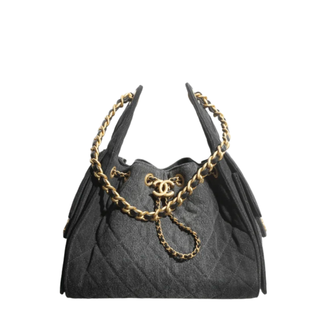 Borsa Chanel in denim nero e metallo dorato 30 cm