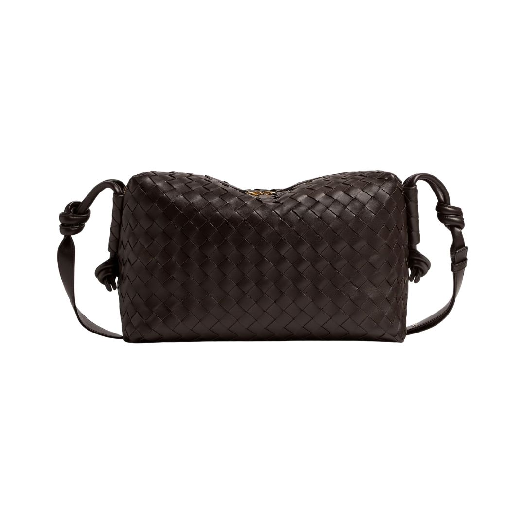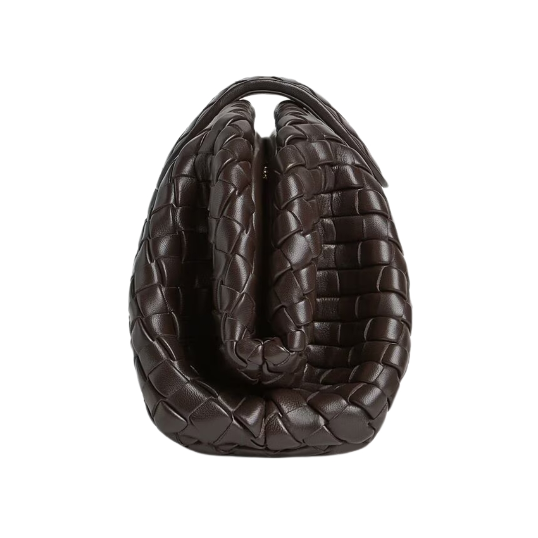 Dimensioni:● Larghezza: 18,5 cm● Altezza: 14 cm● Profondità: 8 cm Dettagli:● Materiale: Pelle intrecciata● Colore: Marrone fondente● Chiusura: Zip superiore●