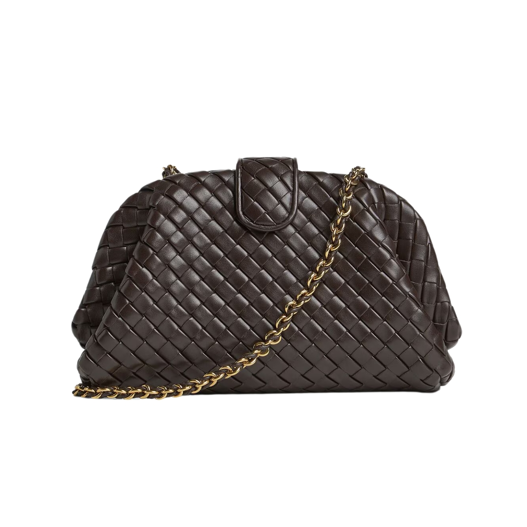 Dimensioni:● Larghezza: 15 cm● Altezza: 11 cm● Profondità: 5 cm Dettagli:● Materiale: Pelle imbottita Intrecciato● Colore: Marrone fondente● Chiusura: Chiusura